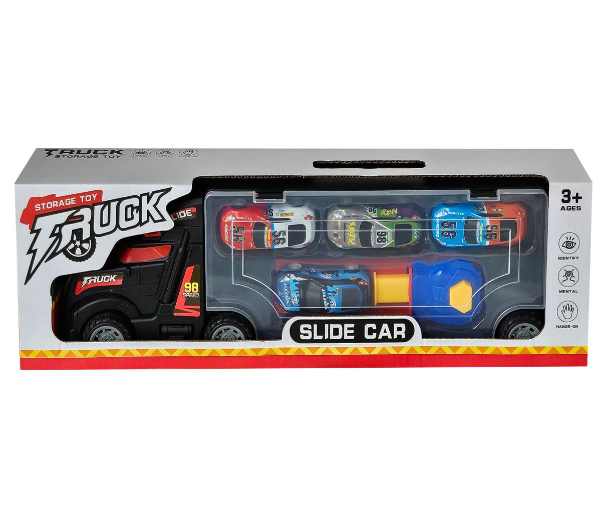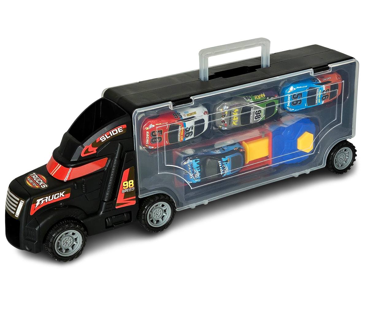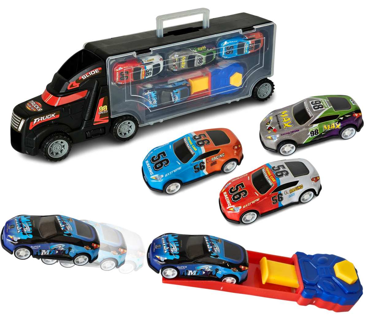 Kamión s pretekárskymi autami a vystrelovacou dráhou. Postav autíčko na dráhu, zatlač pružinu na doraz, stlač tlačidlo a sleduj ako auto vystrelííííí. Balenie obsahuje aj 4ks autíčok. Nevhodné pre deti do 3 rokov.
