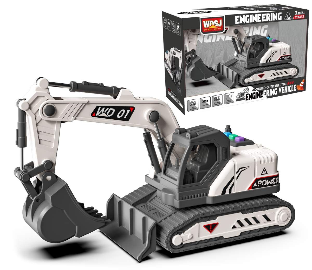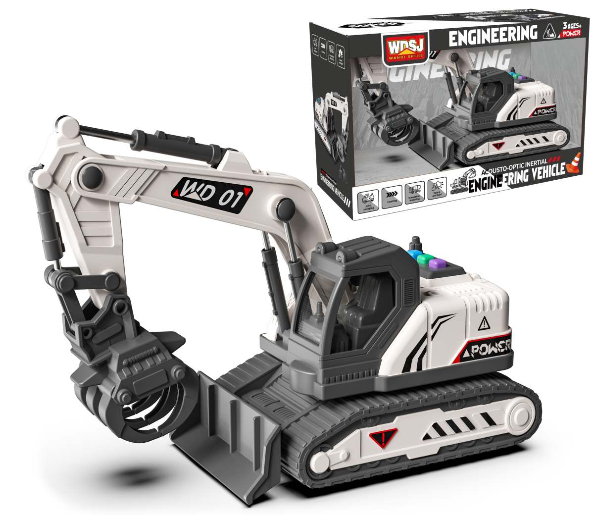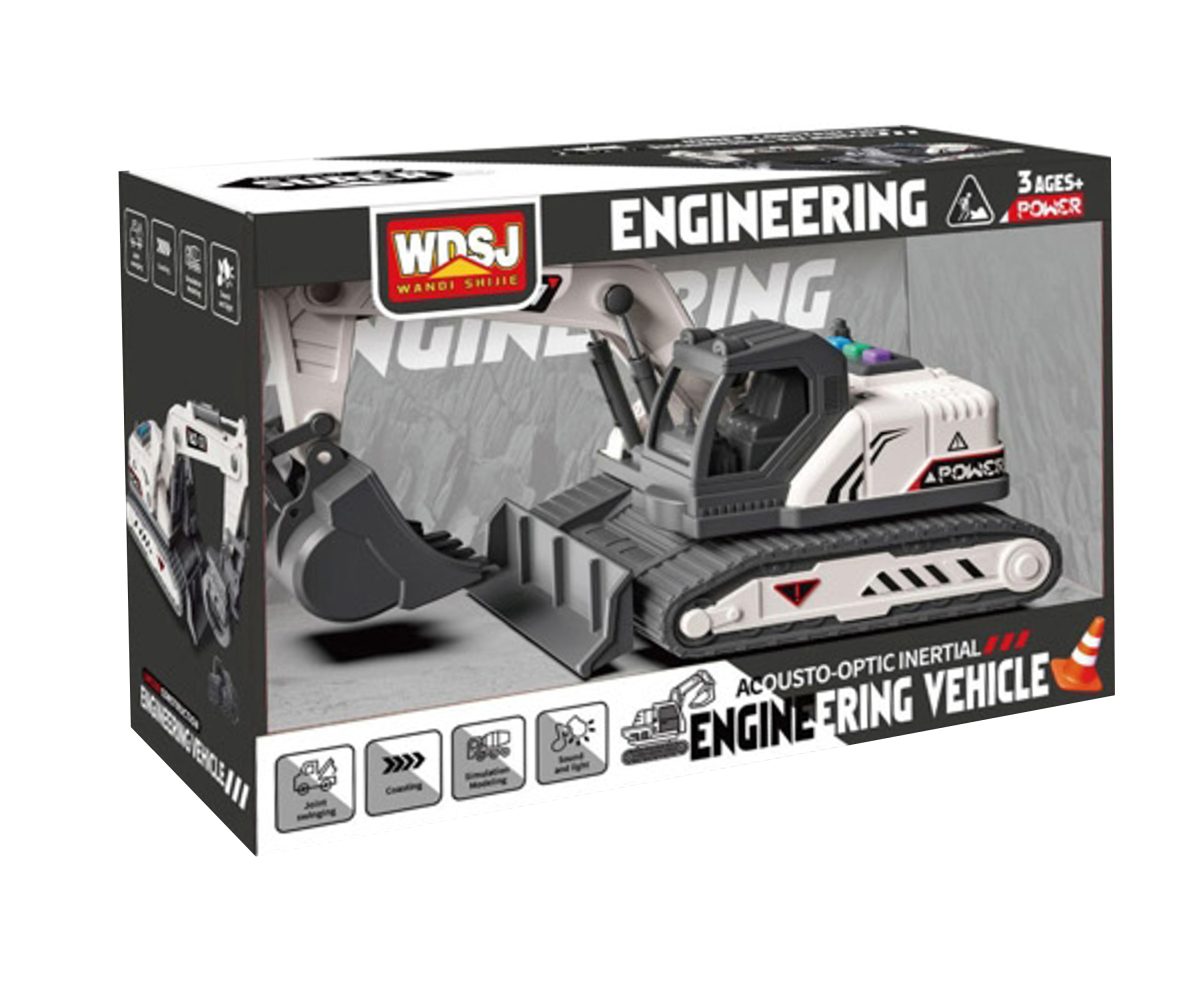 Technické stroje, 1:18 so svetlom a zvukom. Po stlačení tlačidiel na vrchu kabíny, budeš počuť rôzne zvuky (štartovanie, práce alebo zvuk cúvania), popritom blikajú svetlá. Manuálne ovládanie. Hračka vyžaduje 3ks gombíkových batérií typu AG13, ktoré sú súčasťou balenia. Možnosť výberu z troch druhov – zbíjačka, báger alebo auto s rukou. Nevhodné pre deti do 3 rokov.
