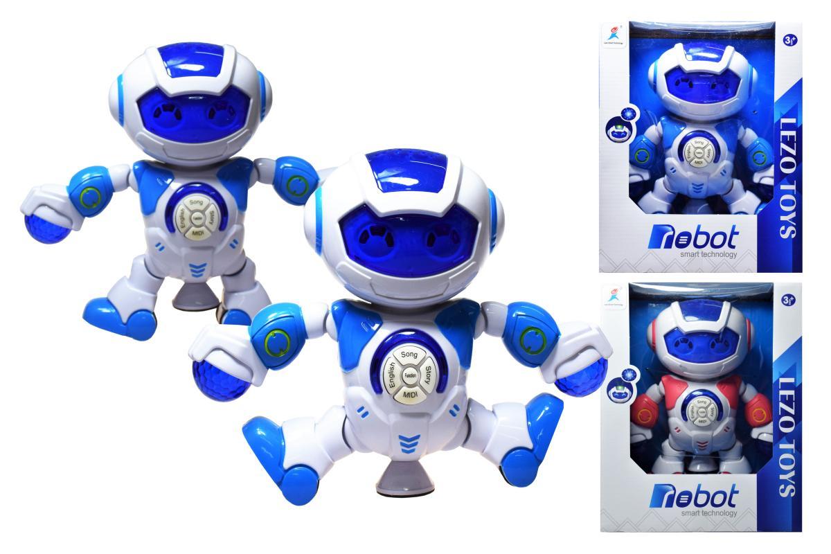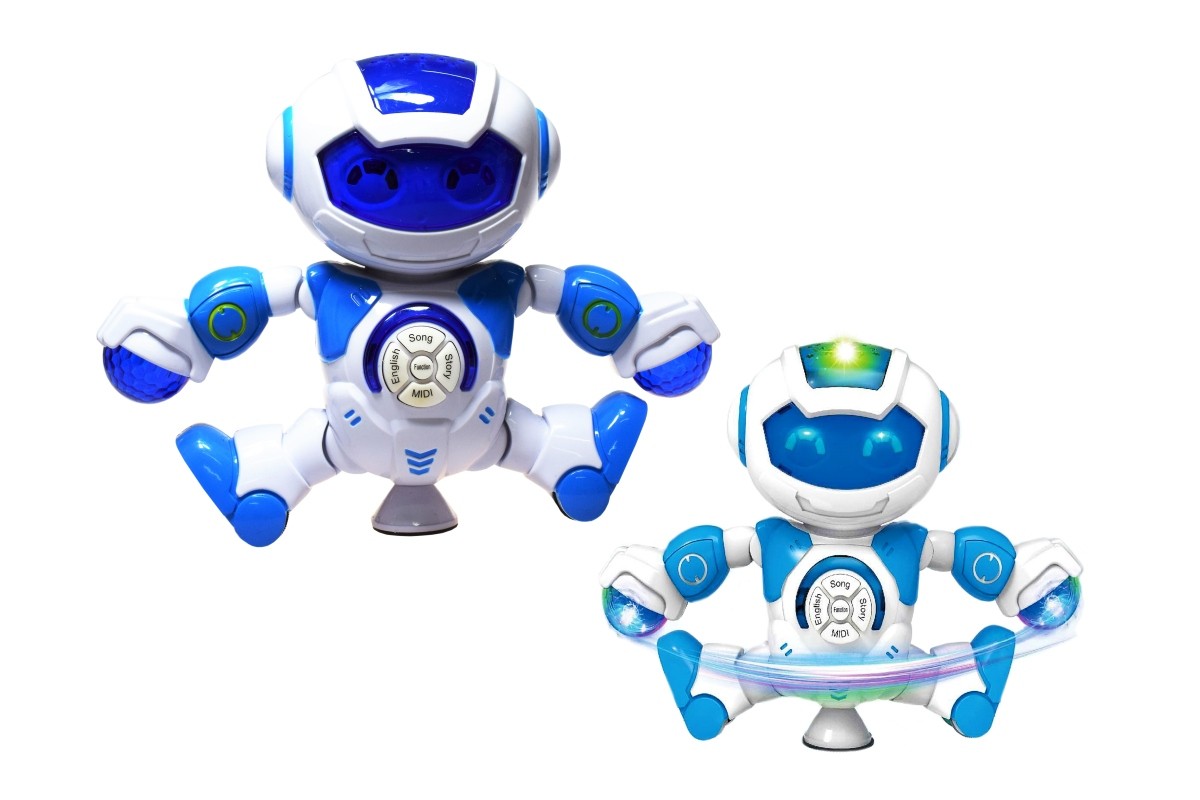 Spestri si deň hravou formou učenia angličtiny. Tancujúci robot po zapnutí tancuje, svietia mu očká, z vrchu na hlavičke mu premieta projekcia oblohu a ruky svetelné efekty. Na brušku má robot ovládanie na prehrávanie pesničiek – SONG, rozprávanie príbehu – STORY a výučba angličtiny – ENGLISH. Tlačidlom MIDI pustíš hudbu. Hračka vyžaduje 3ks 1,5V batérií typu AA, ktoré nie sú súčasťou balenia. Možnosť výberu z dvoch farieb a to modrý alebo ružový. Nevhodné pre deti do 3 rokov. Výška robota – 20cm