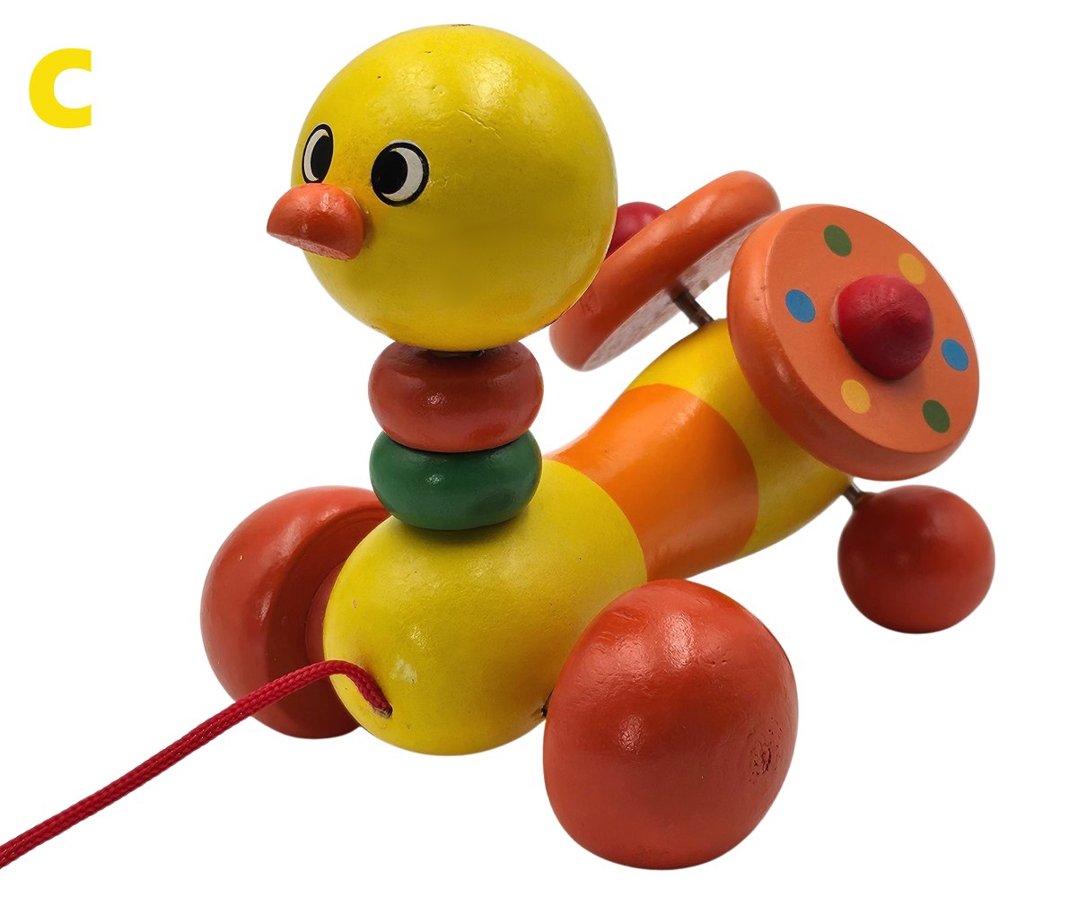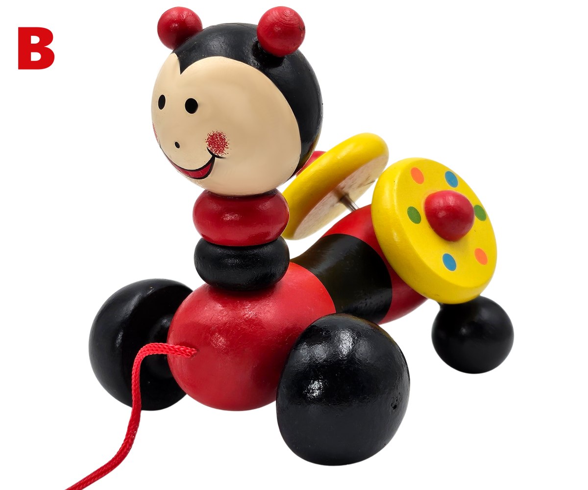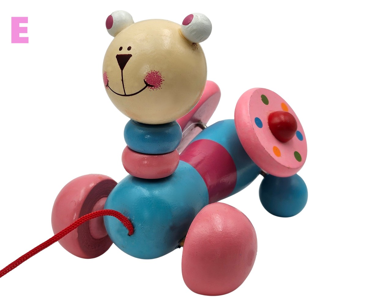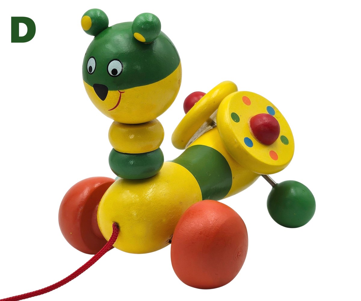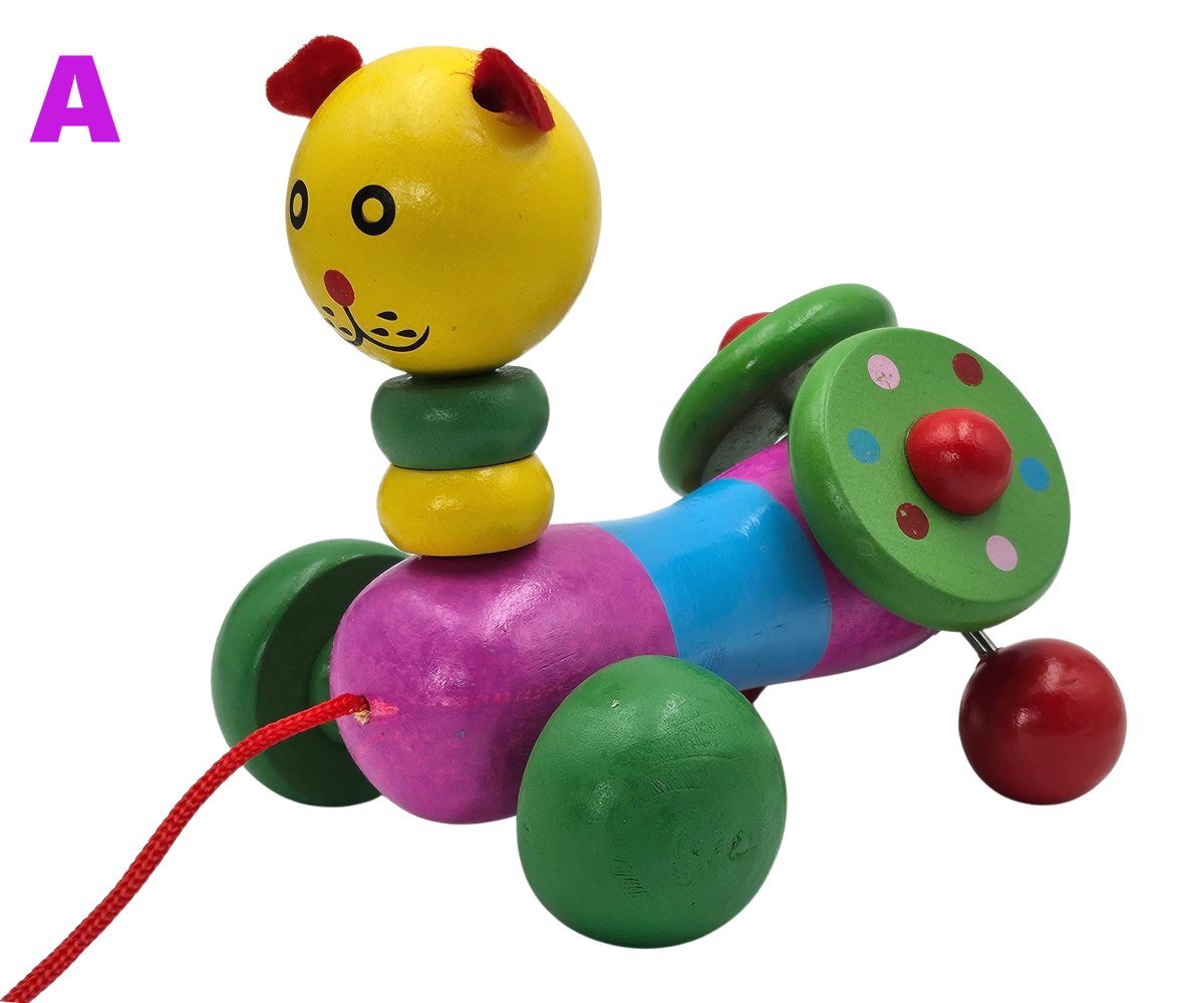 Drevené 11,5cm farebné zvieratko na ťahanie. Pomocou pohybu zadných kolies sa začnú krútiť farebné kolieska vzadu. Možnosť výberu z piatich druhov. Nevhodné pre deti do 3 rokov.