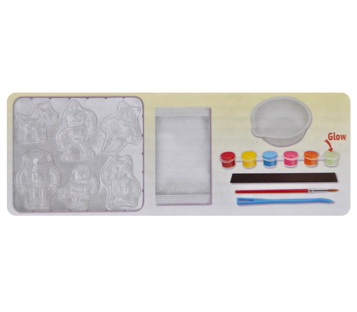 Obdaruj kamaráta, ocka alebo starkého vlastnoručne vyrobenou magnetkou. Roztomilé magnetky svietiace v tme v šiestich tvaroch. Balenie obsahuje: sadru, mištičku na miešanie sadry, miešaciu tyčinku, formu na šesť odliatkov, štetec, päť farieb + farbičku svietiacu v tme a magnetku. Nevhodné pre deti do 3 rokov. Odporúčaný vek od 5 rokov.