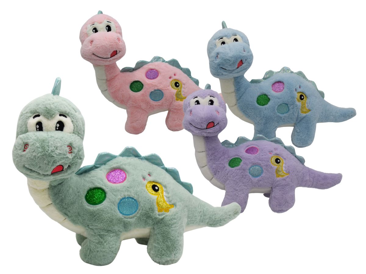 Roztomilý plyšový dino Monty s nášivkami, ktorý ti rozveselý deň. Možnosť výberu z niekoľkých farieb – zelený, fialový, modrý alebo ružový. Rozmer – 42 x 58cm