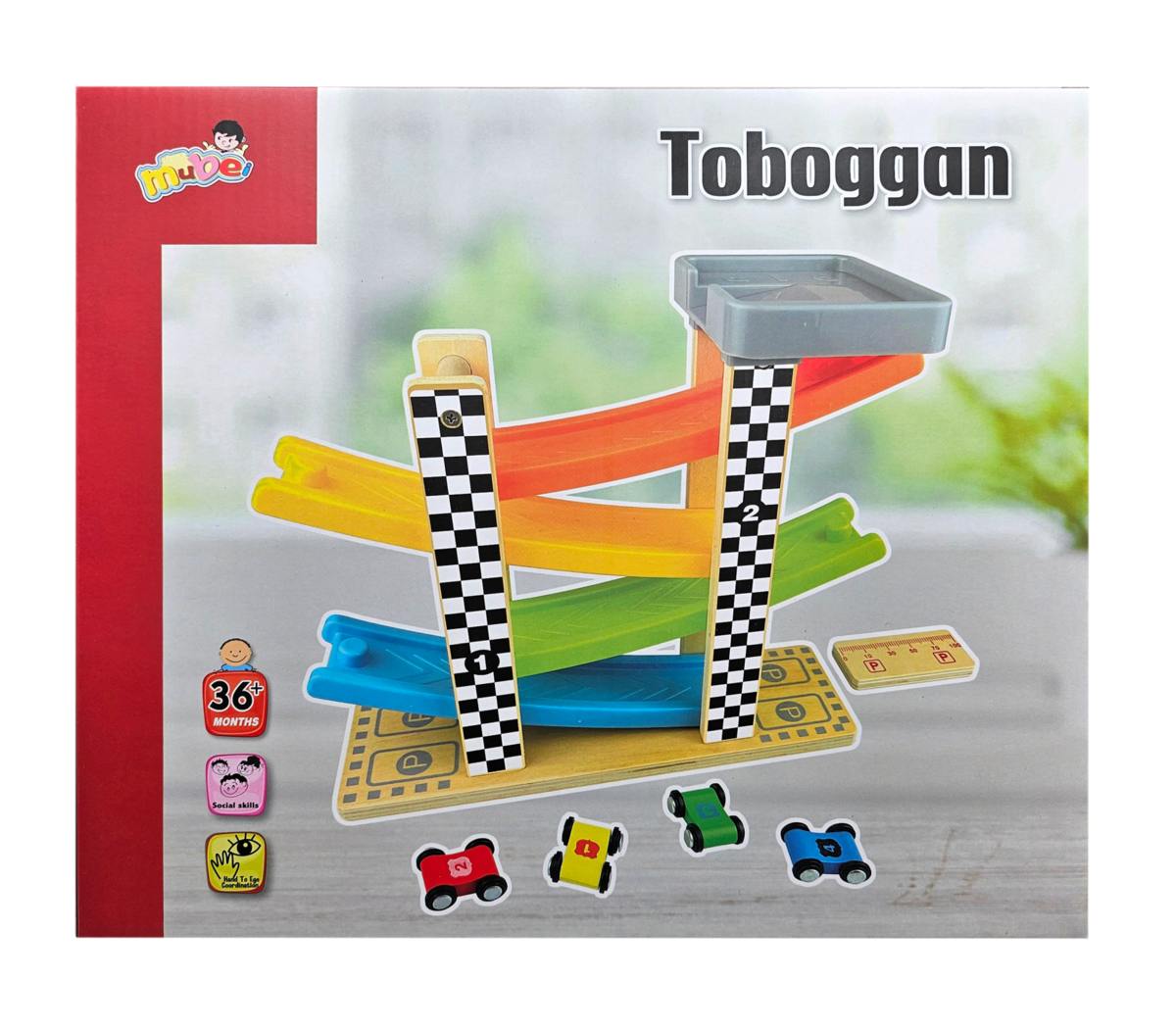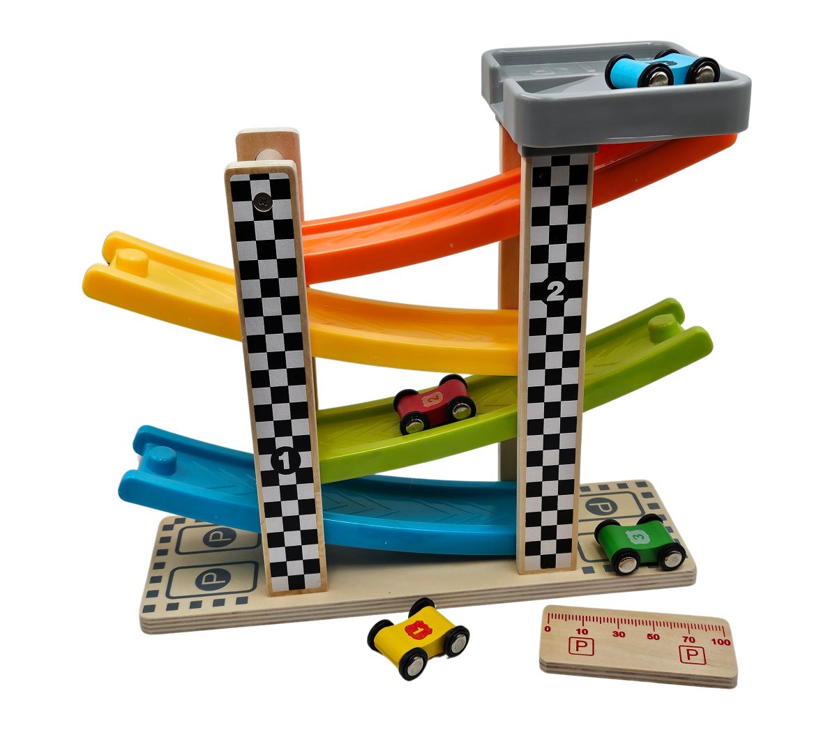 Farebná drevená štvordráha. Pusti autíčko z najvyššieho miesta a pozeraj ako ide dole. Balenie obsahuje dráhu a štyri autíčka. Nevhodné pre deti do 3 rokov.